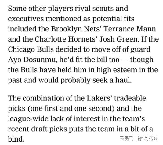 所以从目前消息来看,湖人欲提升侧翼防守,这不但可以减轻核心球员身上压力,而且在决胜时刻,也具备一些变招,让更多球员有机会留在场上。媒体就列出三大引援目标,前快船工兵特伦斯-曼恩领衔,另外两名被提及球员,包括黄蜂前锋约什-格林和公牛的多森姆。